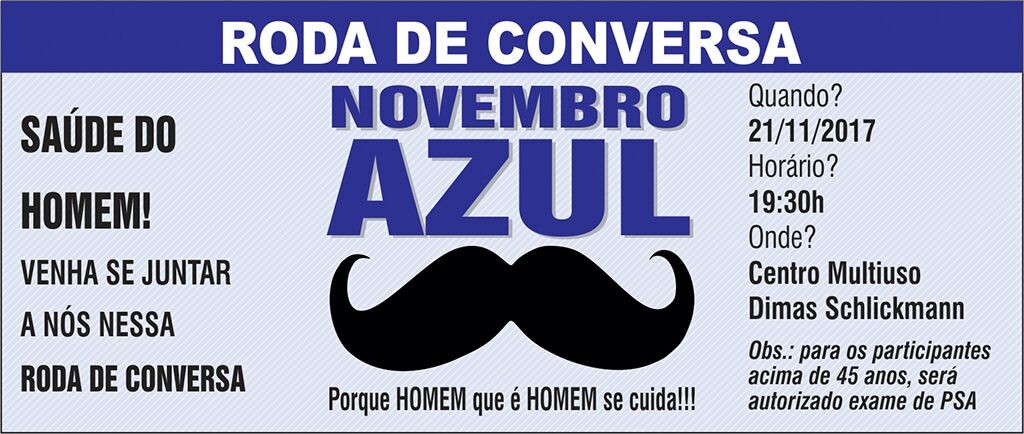 Com profissional convidado, será ralizado no Centro Multiuso do município, uma roda de conversa sobre o cancer de prostata. Após o evento todos os participantes com mais de 45 anos, receberão do RC de São Ludgero um requerimento para a efetuação dos exames de prostata.